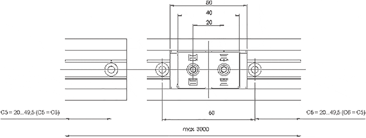 | Nr kat. | maks. długość szyny | a | C4 | A3 | C5=C6 | h | h1 | K1* | ly | lz | Masa szyny | Cena / m | ||