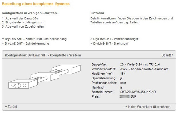 W celu zaprojektowania prowadnicy drylin® do aplikacji indywidualnej, konfigurator odnosi się do określonej strony produktu. Można konfigurować prowadnice liniowe drylin® T, niskoprofilowe prowadnice drylin® N i stoliki śrubowe drylin® SHT. Specjalne długości, potencjalna regulacja luzu i akcesoria są dobrane w tym samym czasie według wymagań.