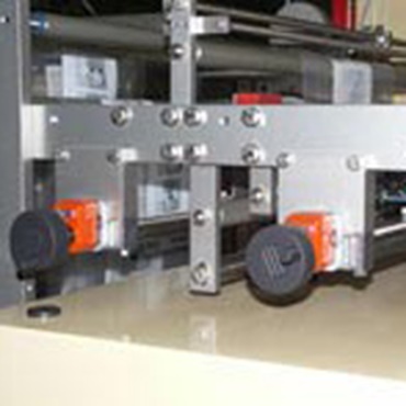 Regulacja formatu za pomocą czujników systemu wykrywania krawędzi i rozpoznawania nadruków przez stół liniowy drylin® SLW ze wskaźnikiem pozycji i pokrętłem (wygodne i powtarzalne pozycjonowanie z zewnątrz)