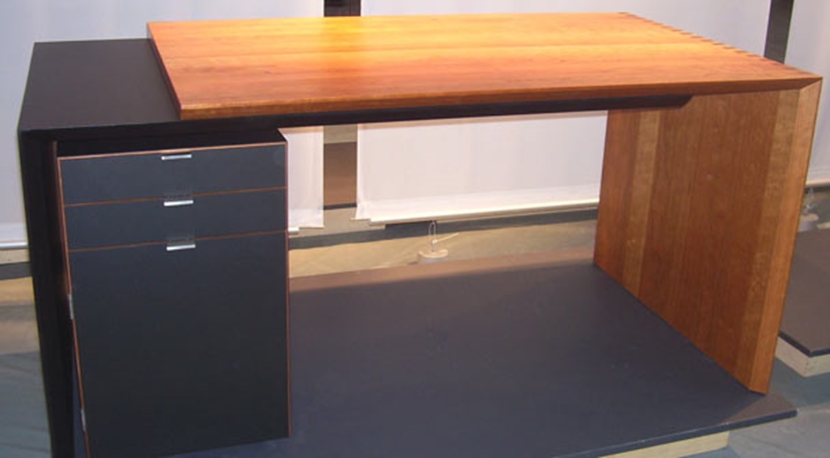 The 1st prize went to Simon Claus. His writing desk stole the show with an appealing color and material selection as well as with refined details. The solid, L-shaped cherry wood worktop can be moved on glide rails, thus enlarging the work space. The dark-gray linoleum endows a noble touch to the cherry wood.