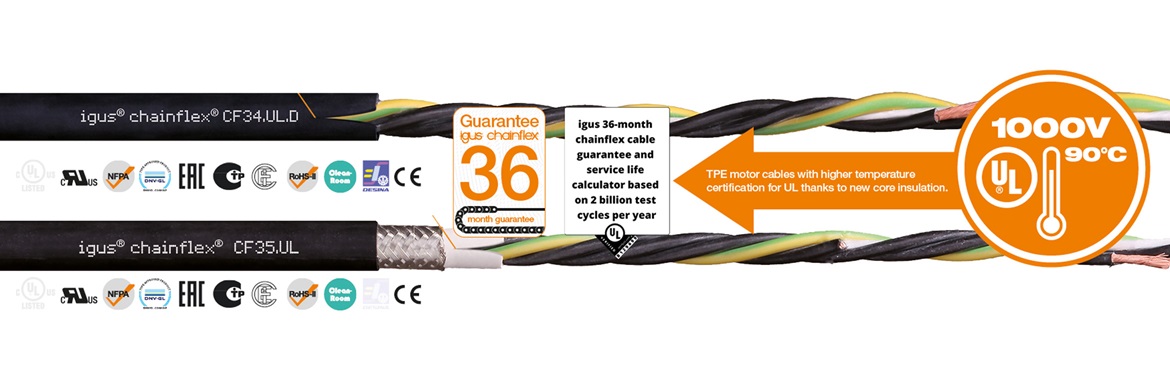 Nowe, wysokiej klasy przewody silnikowe od chainflex zostały zaprojektowane z ulepszoną izolacją żyły zgodnie z atestem UL dla temperatury do 90° Celsjusza . cWraz z klasą napięcia 1000 V należą one do najmocniejszych przewodów silnikowych na rynku.