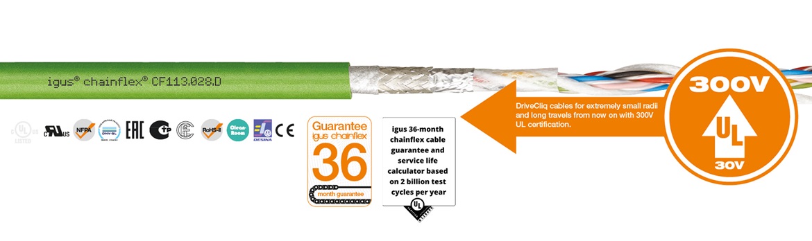 Nowy przewód systemu pomiarowego chainflex® PUR CF113.028.D zgodnie ze standardem DriveCliq otrzymał atest do użytku z 300V UL.