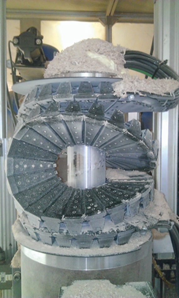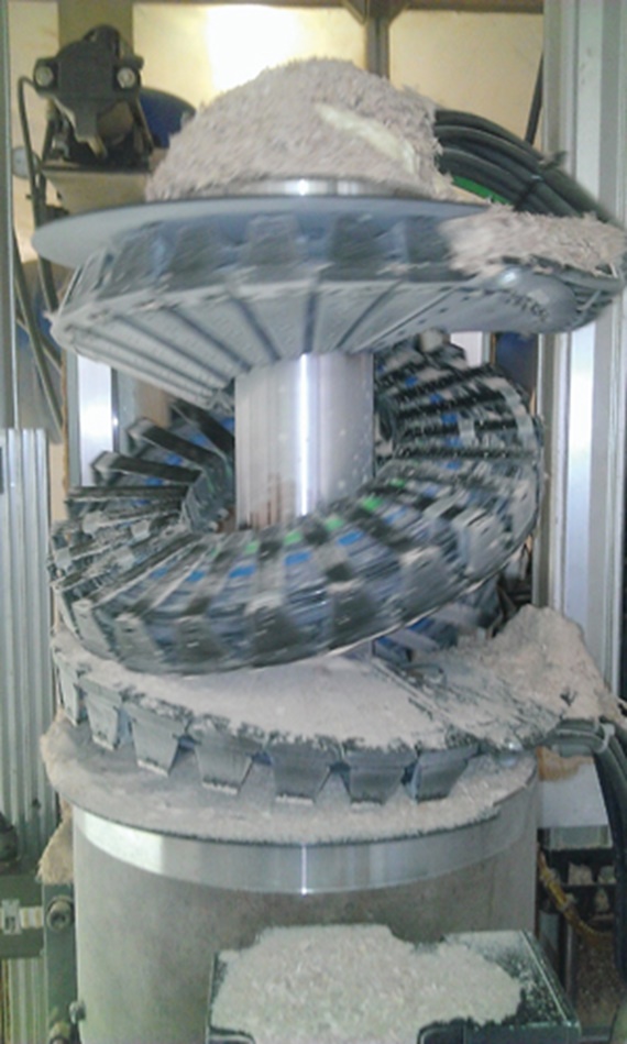 The rotary collectors of this woodworking machine were extremely prone to malfunction in the past, and had to be renewed every six months due to damaged electric and hydraulic lines. Thanks to the use of an igus® twisterband® the lines are now guided perfectly during the rotational movement.